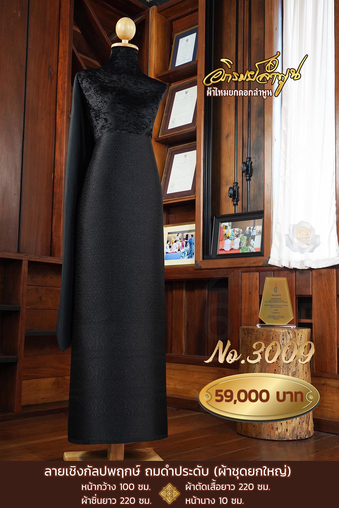 ผ้าชุดยกใหญ่ ลายเชิงกัลปพฤกษ์ ถมดำประดับ หน้ากว้าง100ซม. ผ้าตัดเสื้อยาว220ซม. ผ้าซิ่นยาว220ซม. หน้านาง10ซม.